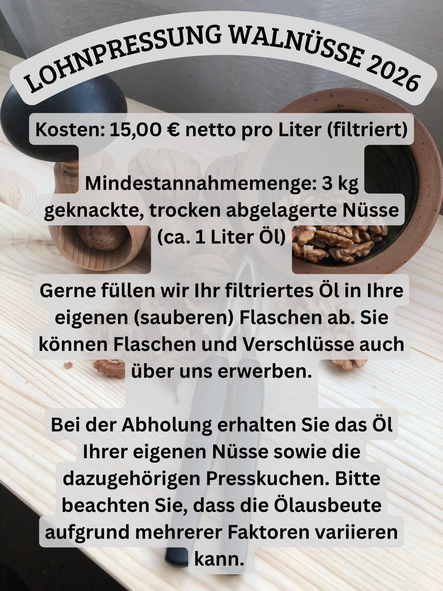 Wir pressen wieder für Sie im Lohn. Bitte vereinbaren Sie einen der Termine für die Abgabe Ihrer Walnüsse. Sie erreichen uns unter Tel: 0671 / 43621 oder 0176 / 22 90 12 41 (Markus Zöllner) oder auch per Mail. Nähere Infos [hier klicken].